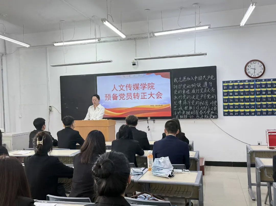 为深化党员队伍建设,严格把控党员发展质量,凝聚党员奋进力量,6月9日,人文传媒学院学生党支部召开预备党员转正大会,对王孟宇等22名预备党员转正事宜进行审议。会议由学生党支部书记赵宇主持。