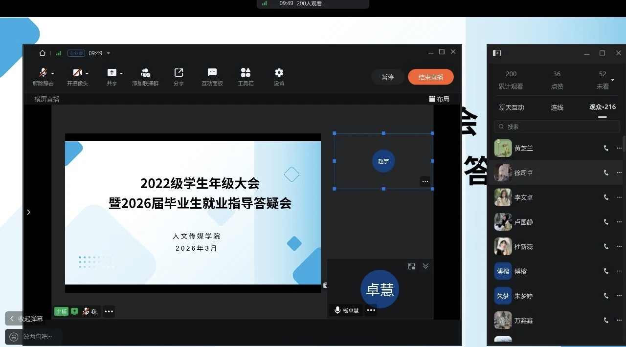为帮助2026届毕业研究生厘清就业流程、明确关键时间节点,提前做好就业准备、从容应对就业季挑战,3月9日,人文传媒学院召开2022级学生年级大会暨2026届毕业生就业指导答疑会,切实为毕业生求职之路保驾护航。