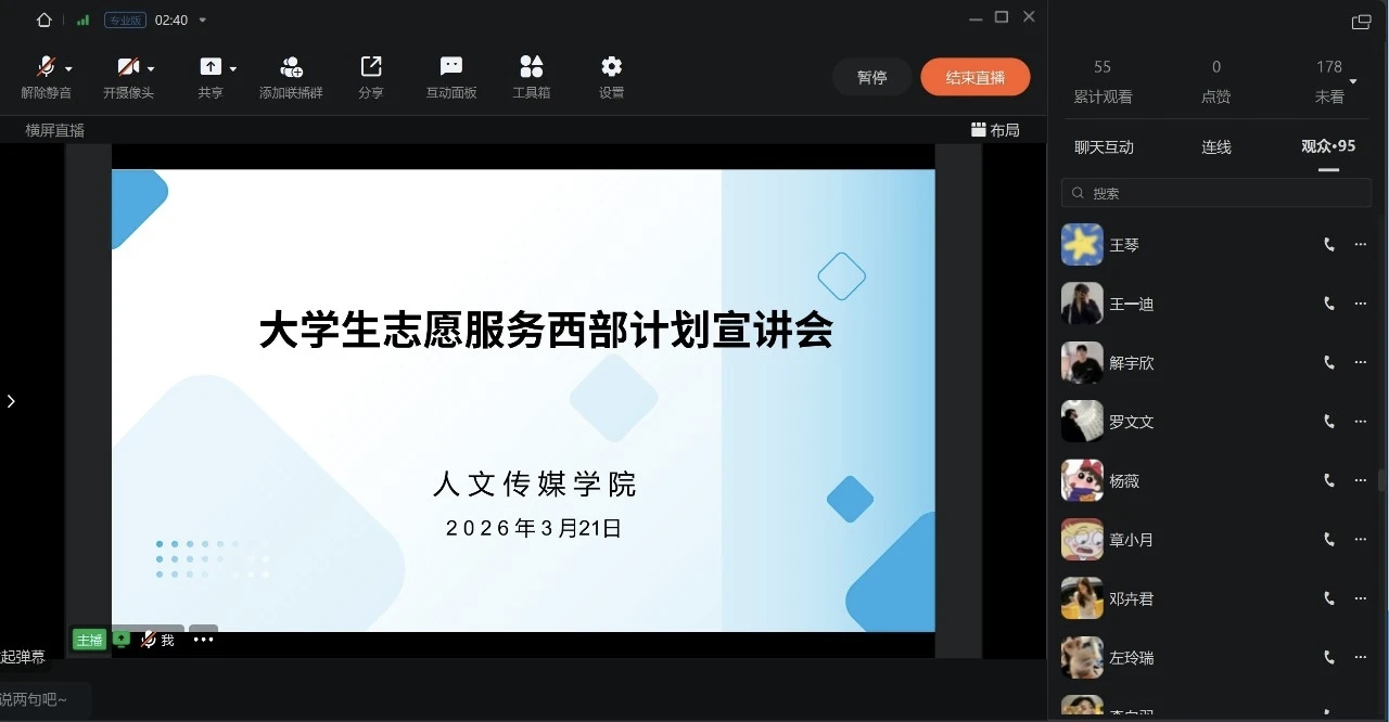 此次宣讲会不仅普及了西部计划政策,更传递了志愿精神。下一步,人文传媒学院将持续做好西部计划宣传动员、报名指导、政策答疑等后续工作,搭建完善的帮扶平台,鼓励更多有志青年奔赴西部、扎根基层,助力更多有志青年奔赴西部、绽放青春。