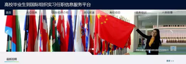 网站分为“首页”、“岗位信息”、“国际组织介绍”、“资讯报道”、“高校动态”、“培养培训”和“人物故事”六块,为同学们提供在国际组织实习与任职的全方位信息。